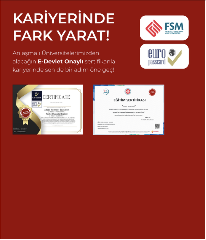 Eğitim süresi boyunca ilk adımından başlayıp son adımına dek nasıl bir yol izlediklerini öğreneceğiniz tüm programlarda hayalinizdeki başarıyı elde edecek sanatınıza veya girişiminize yeni bir bakış açısı kazandıracak ve daha iyi bir pozisyon ile iyi bir başlangıç yapacaksınız ,ve Eğitim sonunda alacağınız sertifikalar ömür boyu sizi mutlu etmeye ve kariyerinizde başarıların için imza atmaya yetecektir.
