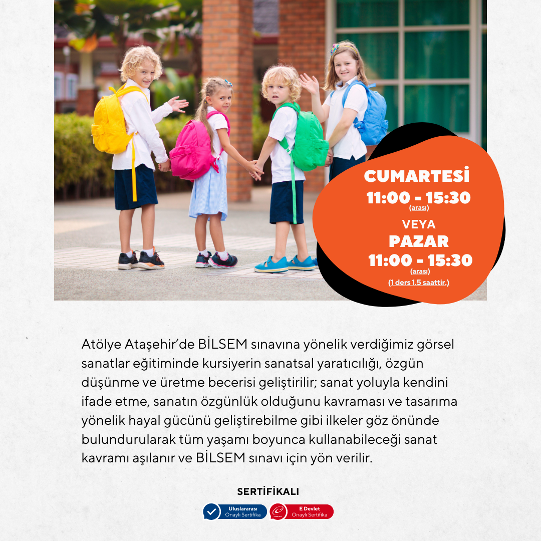 Atölye Ataşehir’de BİLSEM sınavına yönelik verdiğimiz görsel sanatlar eğitiminde kursiyerin sanatsal yaratıcılığı, özgün düşünme ve üretme becerisi geliştirilir; sanat yoluyla kendini ifade etme, sanatın özgünlük olduğunu kavraması ve tasarıma yönelik hayal gücünü geliştirebilme gibi ilkeler göz önünde bulundurularak tüm yaşamı boyunca kullanabileceği sanat kavramı aşılanır ve BİLSEM sınavı için yön verilir.