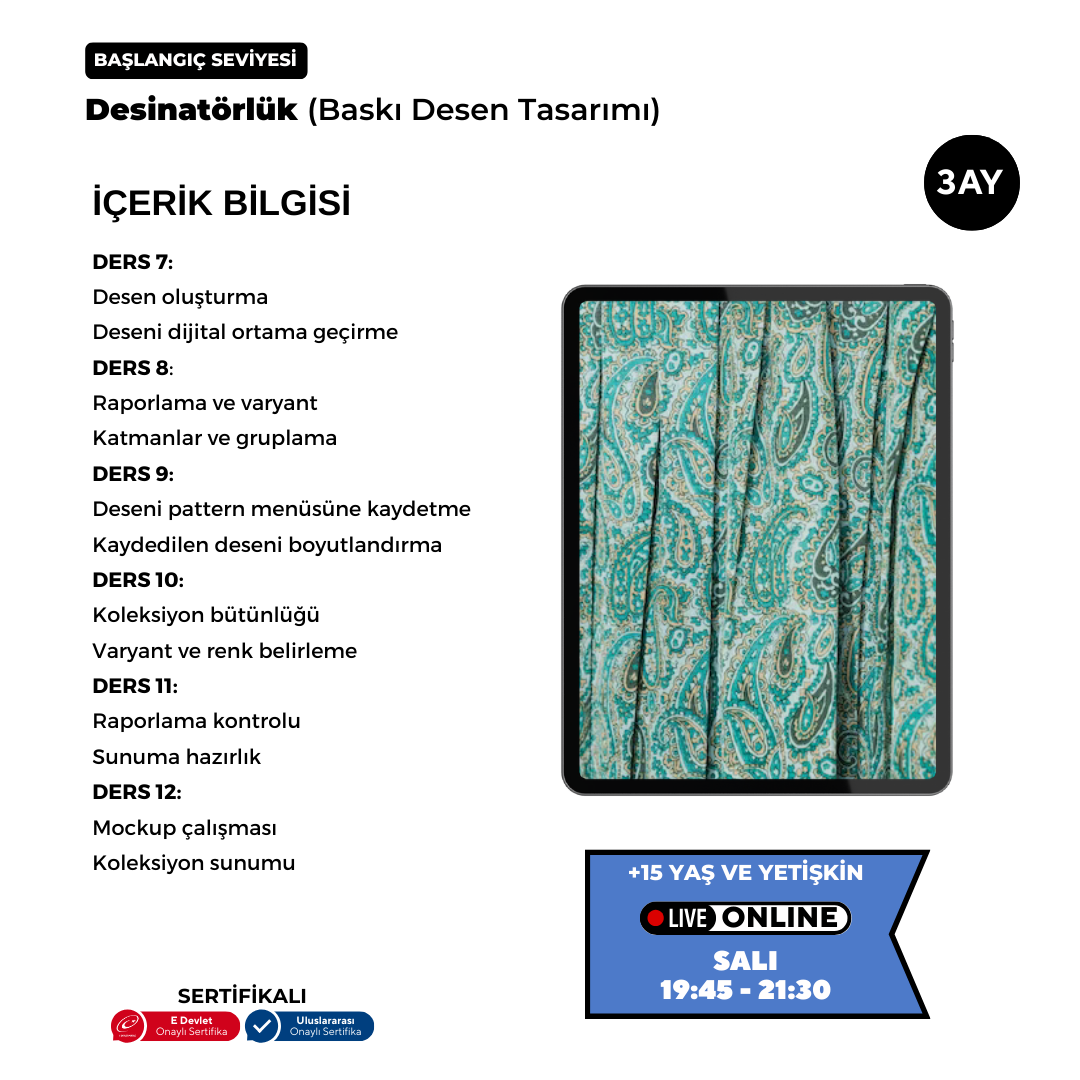 Tekstil sektörünün en gerekli mesleklerinden biri olan desinatörlerin ne iş yaptıklarına yönelik mesleki bilgidir. Katılımcıların, bu mesleği doğru şekilde icra edildiğini öğrenmektedirler. Desinatörlük eğitimi, desinatörün farklı iş alanlarında yer almasını destekleyici ders içeriklerine sahiptir. Ders; tekstil ve tasarımın nasıl birleştiğini ve bir meslek olarak nasıl icra edildiğini katılımcılara anlatılır. Ders sürecinde, bilgisayar destekli tasarım aracılığıyla tekstil malzemelerin nasıl tasarlandığı iletilir. Katılımcılar, edindikleri bilgiler eşliğinde tekstil sektörünün en önemli mesleklerinden birini tanıyarak mesleğe adım atma yolunu açarlar.