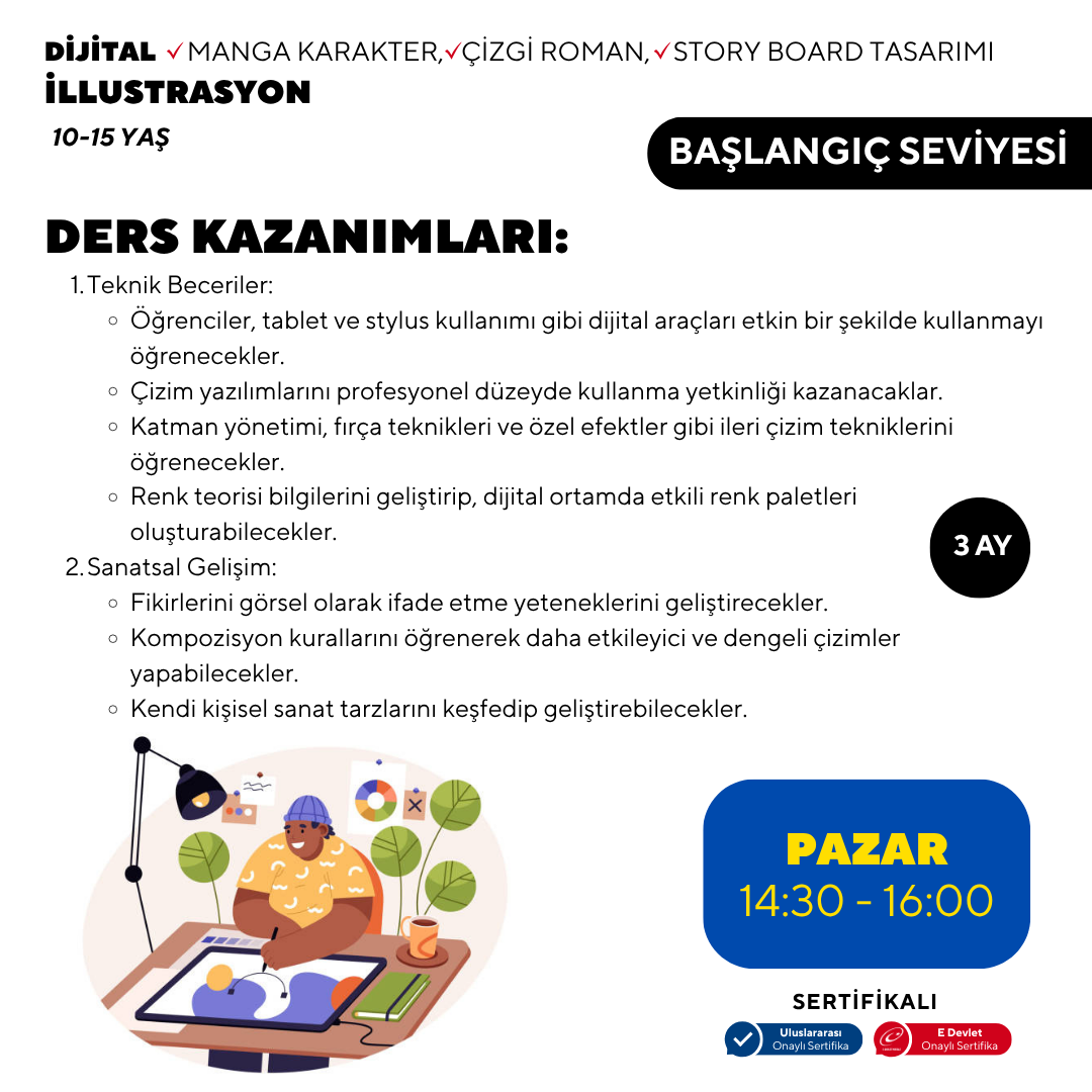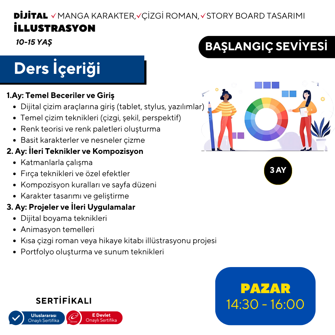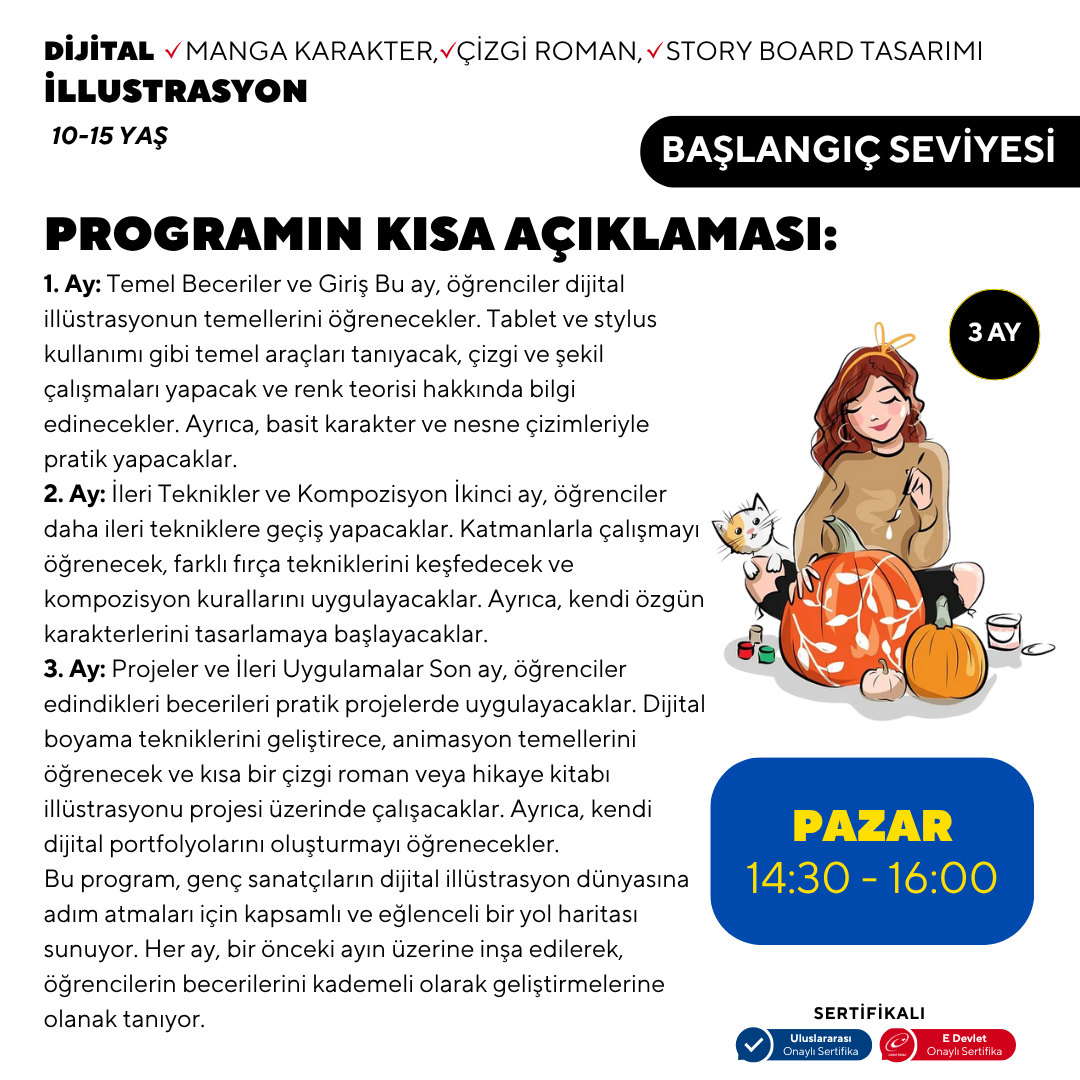 3. Ay: Projeler ve İleri Uygulamalar Son ay, öğrenciler edindikleri becerileri pratik projelerde uygulayacaklar. Dijital boyama tekniklerini geliştirece, animasyon temellerini öğrenecek ve kısa bir çizgi roman veya hikaye kitabı illüstrasyonu projesi üzerinde çalışacaklar. Ayrıca, kendi dijital portfolyolarını oluşturmayı öğrenecekler. Bu program, genç sanatçıların dijital illüstrasyon dünyasına adım atmaları için kapsamlı ve eğlenceli bir yol haritası sunuyor. Her ay, bir önceki ayın üzerine inşa edilerek, öğrencilerin becerilerini kademeli olarak geliştirmelerine olanak tanıyor.