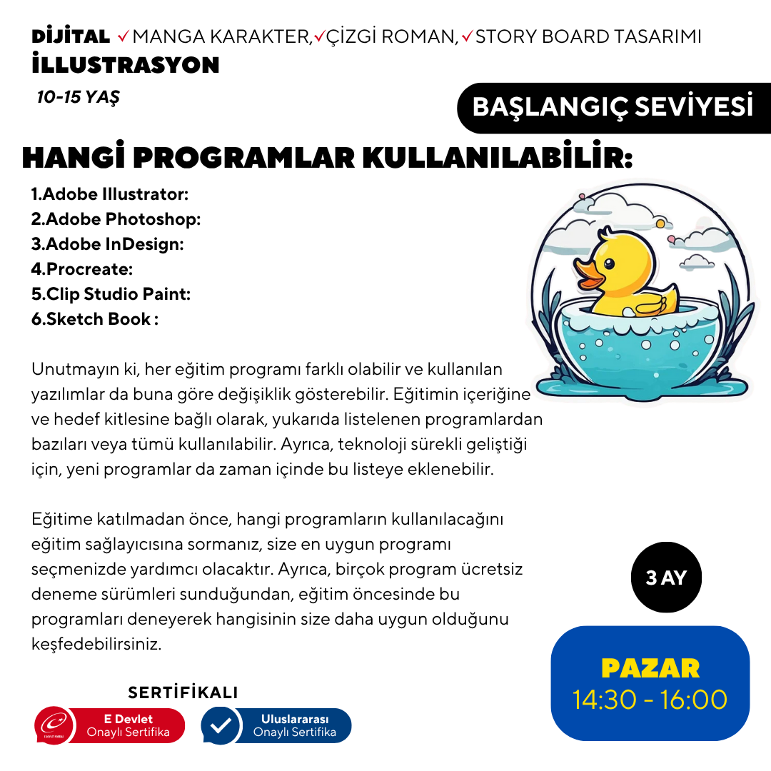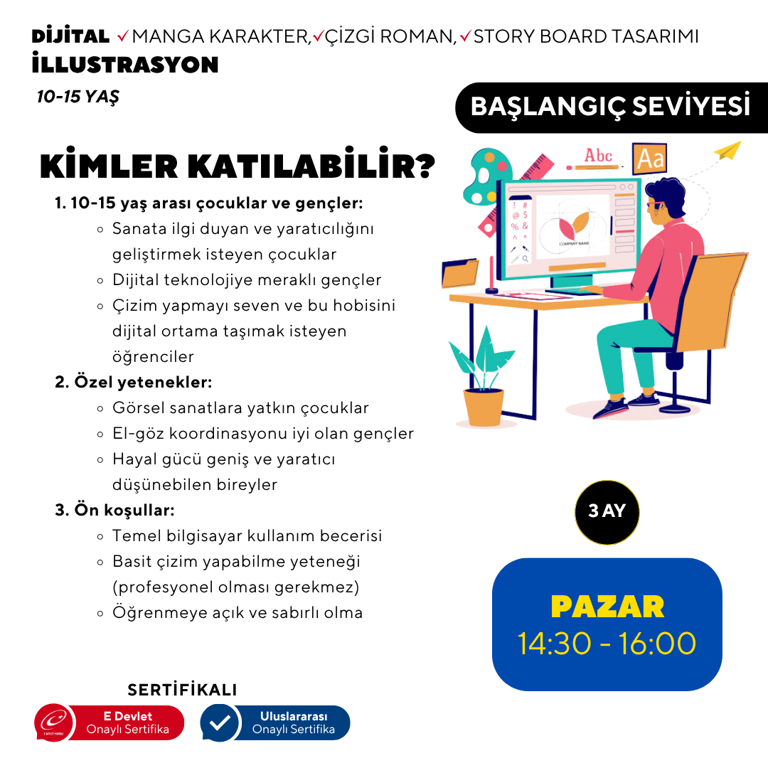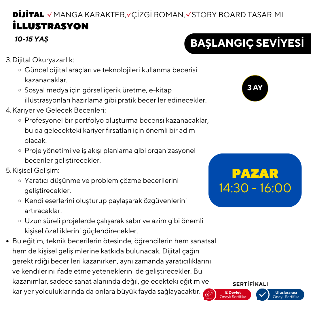 3. Ay: Projeler ve İleri Uygulamalar Son ay, öğrenciler edindikleri becerileri pratik projelerde uygulayacaklar. Dijital boyama tekniklerini geliştirece, animasyon temellerini öğrenecek ve kısa bir çizgi roman veya hikaye kitabı illüstrasyonu projesi üzerinde çalışacaklar. Ayrıca, kendi dijital portfolyolarını oluşturmayı öğrenecekler. Bu program, genç sanatçıların dijital illüstrasyon dünyasına adım atmaları için kapsamlı ve eğlenceli bir yol haritası sunuyor. Her ay, bir önceki ayın üzerine inşa edilerek, öğrencilerin becerilerini kademeli olarak geliştirmelerine olanak tanıyor.