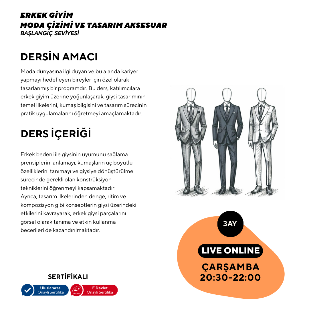 Moda dünyasına ilgi duyan ve bu alanda kariyer yapmayı hedefleyen bireyler için özel olarak tasarlanmış bir programdır. Bu program, katılımcılara erkek giyim üzerine yoğunlaşarak, giysi tasarımının temel ilkelerini, kumaş bilgisini ve tasarım sürecinin pratik uygulamalarını öğretmeyi amaçlamaktadır.