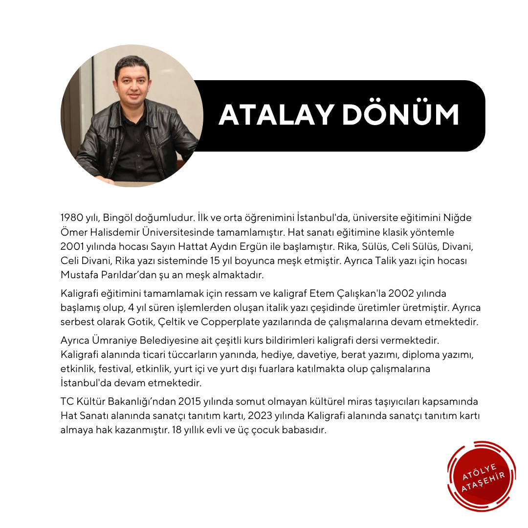 Ayrıca Ümraniye Belediyesine ait çeşitli kurs bildirimleri kaligrafi dersi vermektedir. Kaligrafi alanında ticari tüccarların yanında, hediye, davetiye, berat yazımı, diploma yazımı, etkinlik, festival, etkinlik, yurt içi ve yurt dışı fuarlara katılmakta olup çalışmalarına İstanbul'da devam etmektedir.
