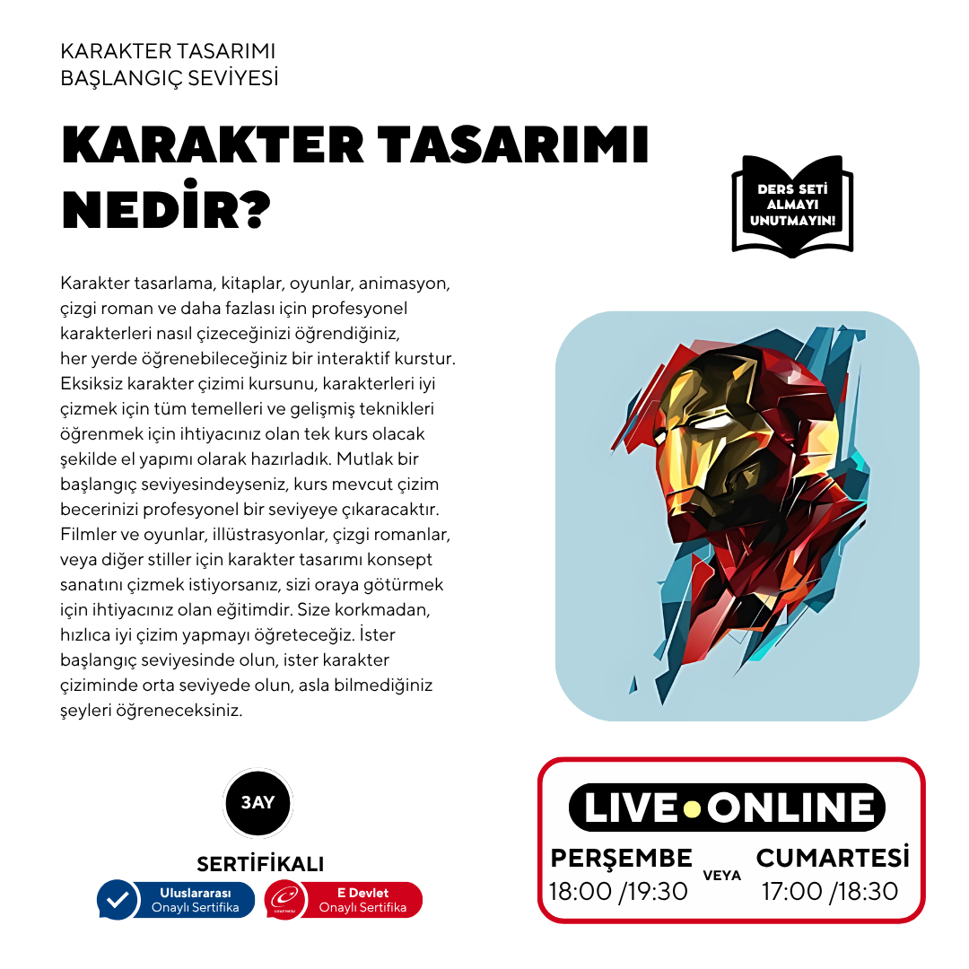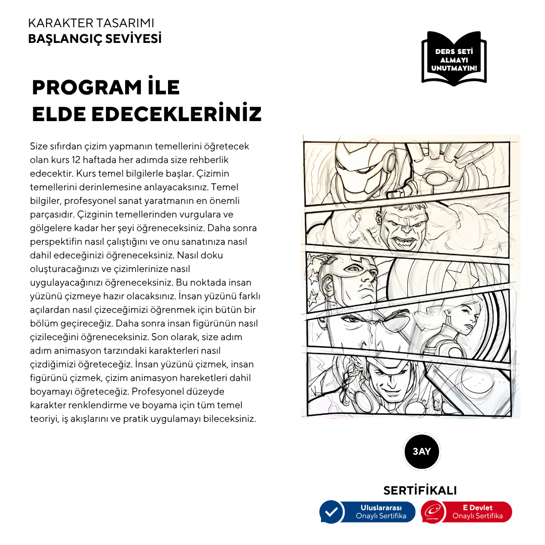 Mutlak bir başlangıç seviyesindeyseniz, kurs mevcut çizim becerinizi profesyonel bir seviyeye çıkaracaktır. Filmler ve oyunlar, illüstrasyonlar, çizgi romanlar, veya diğer stiller için karakter tasarımı konsept sanatını çizmek istiyorsanız, sizi oraya götürmek için ihtiyacınız olan eğitimdir. Size korkmadan, hızlıca iyi çizim yapmayı öğreteceğiz.