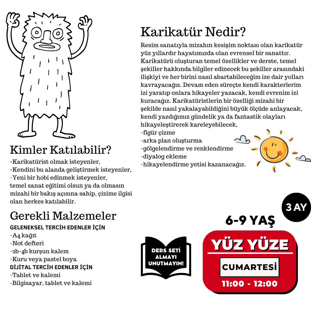 Bu derslerin neticesinde ise katılımcıların kolaylıkla karikatür çizmeye başlayabileceklerini ifade edebiliriz. Karikatür dersi ile çizim yeteneğiniz artar, mizah duygunuz gelişir Bu konuda hiçbir yeteneği olmayan çocuklarınız başarı elde edebileceklerinden şüpheniz olmasın.