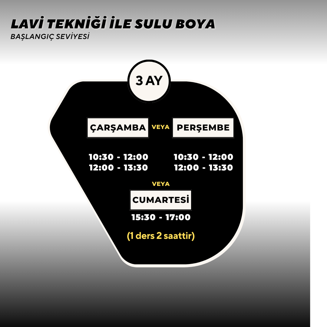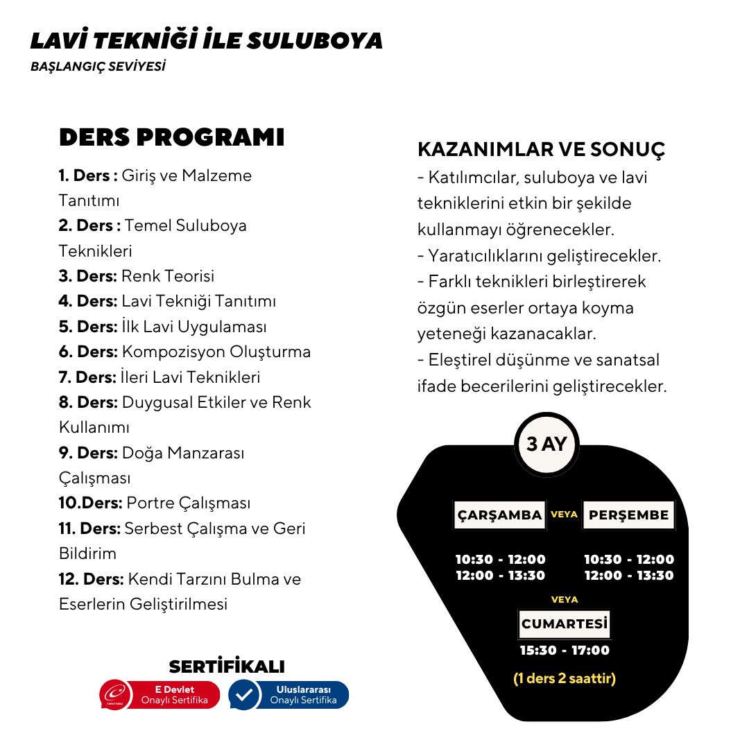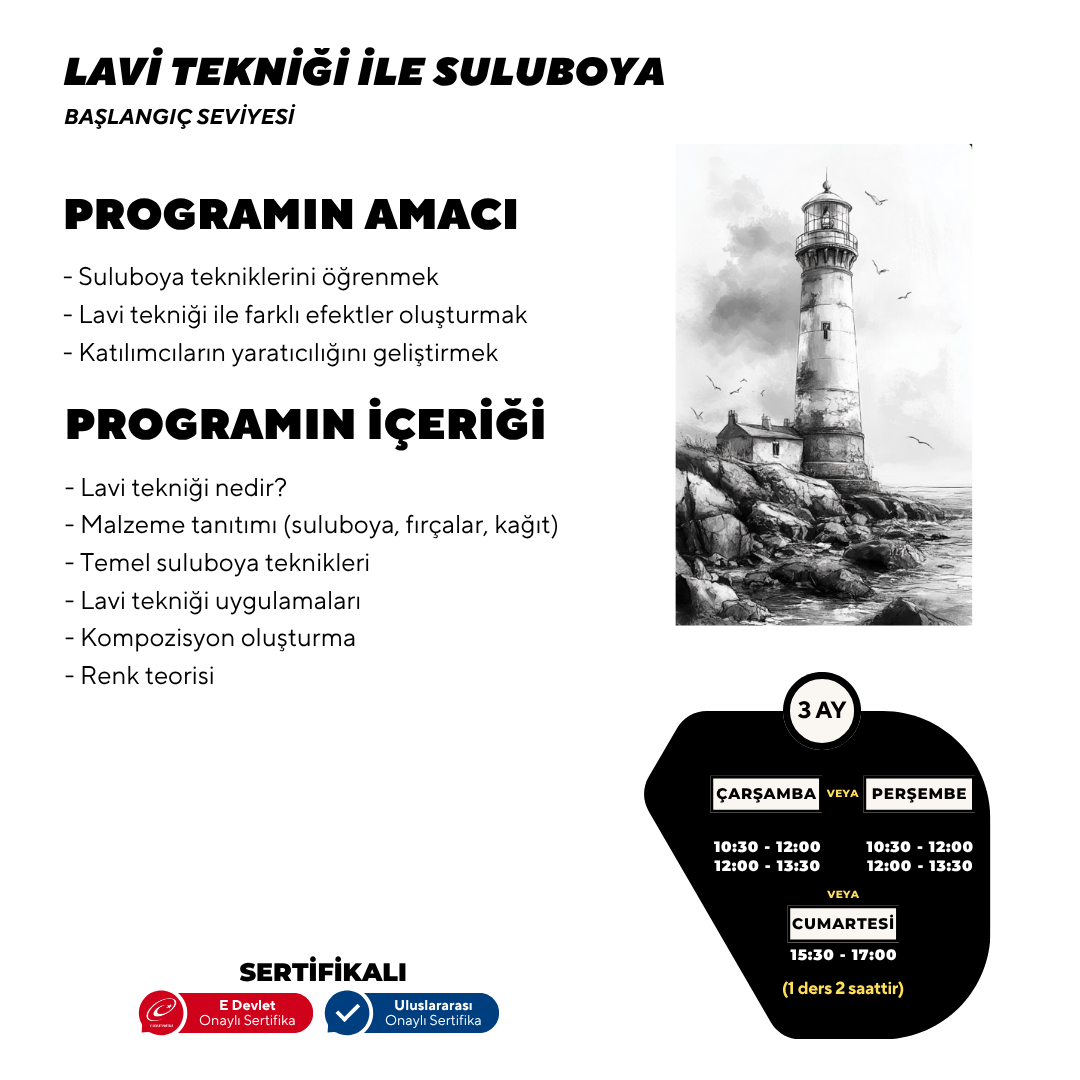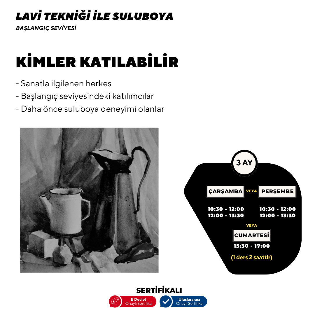 - Katılımcılar, suluboya ve lavi tekniklerini etkin bir şekilde kullanmayı öğrenecekler.