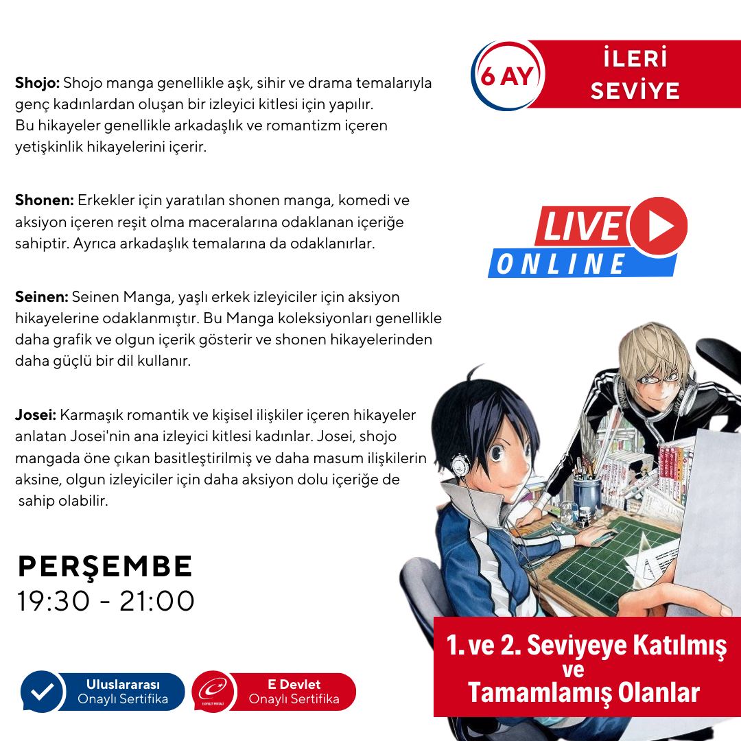 •Josei: Karmaşık romantik ve kişisel ilişkiler içeren hikayeler anlatan Josei'nin ana izleyici kitlesi kadınlar. Josei, shojo mangada öne çıkan basitleştirilmiş ve daha masum ilişkilerin aksine,olgun izleyiciler için daha aksiyon dolu içeriğe de sahip olabilir.