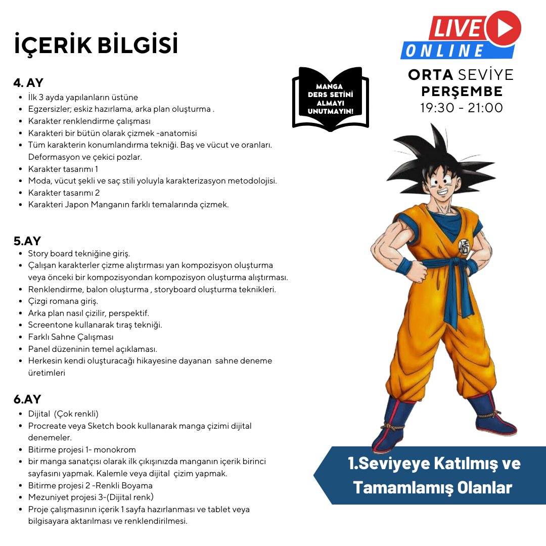 Manga Çizim ve Anime karakterleri için Atölye Ataşehir tarafından seviyelere uygun olarak hazırlanmış manga çizim ve anime çalışma kitabı kullanılacaktır.