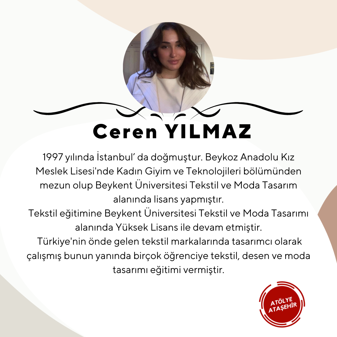1997 yılında istanbul’ da doğmuştur. Beykoz Anadolu kız meslek lisesinde kadın giyim ve teknolojilerin den mezun olup Beykent üniversitesi Tekstil ve Moda Tasarım alanında lisans yapmıştır. Tekstil eğitimine Beykent üniversitesi Tekstil ve Moda Tasarımı alanında Yüksek Lisans ile devam etmiştir. Türkiyenin önde gelen tekstil markalarında tasarımcı olarak çalışmış bunun yanında birçok öğrenciye tekstil,desen ve moda tasarımı eğitimi vermiştir.