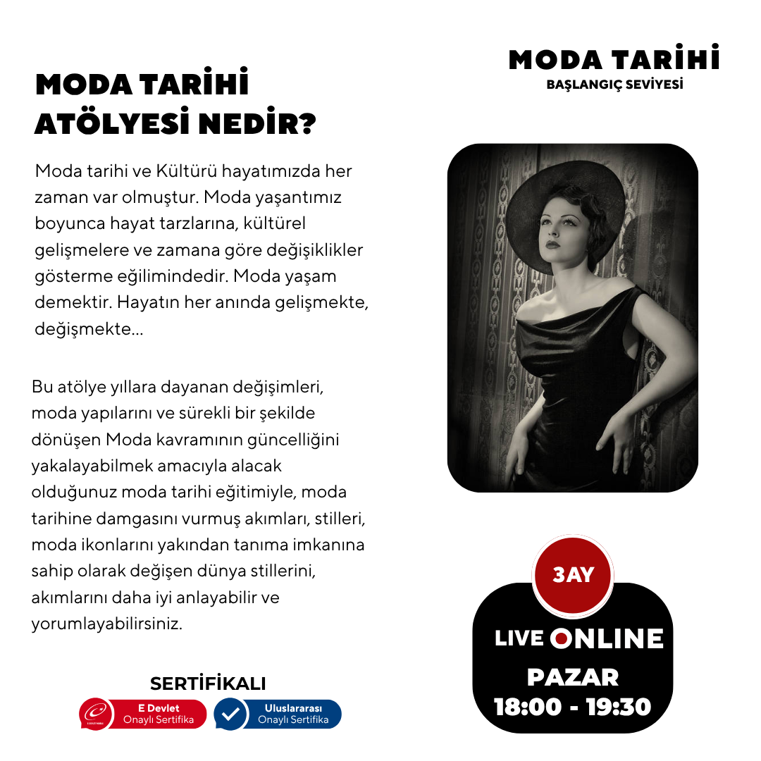 Bu dersle yıllara dayanan değişimleri yapısını ve sürekli bir şekilde dönüşen Moda kavramını güncelliğini yakalayabilmek alacağınız bu dersle öğrenecek ve entelektüel bakış açısı kazanıp analizlerle, değişen dünya gerekliliklerini daha iyi anlayabilir ve yorumlayabileceksiniz.