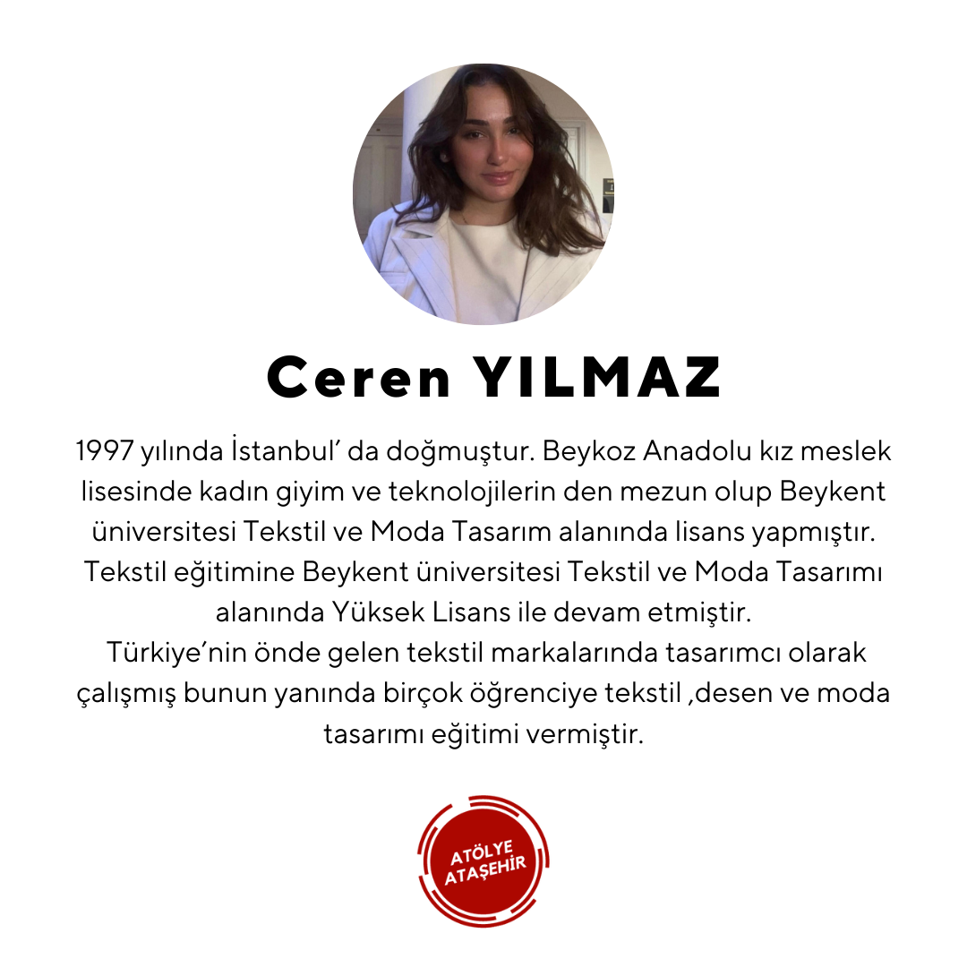 1997 yılında istanbul’ da doğmuştur. Beykoz Anadolu kız meslek lisesinde kadın giyim ve teknolojilerin den mezun olup Beykent üniversitesi Tekstil ve Moda Tasarım alanında lisans yapmıştır. Tekstil eğitimine Beykent üniversitesi Tekstil ve Moda Tasarımı alanında Yüksek Lisans ile devam etmiştir. Türkiyenin önde gelen tekstil markalarında tasarımcı olarak çalışmış bunun yanında birçok öğrenciye tekstil,desen ve moda tasarımı eğitimi vermiştir.
