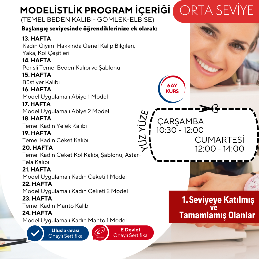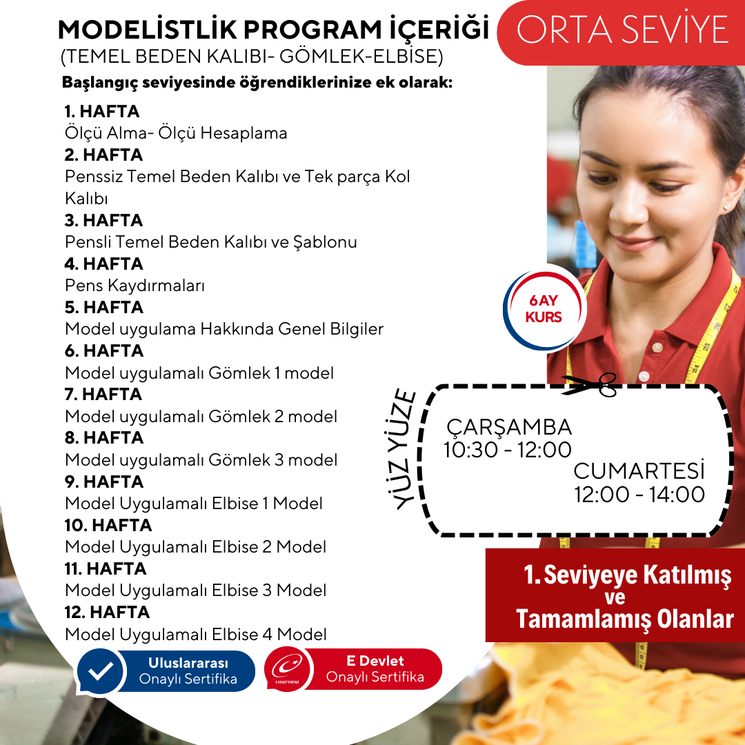 Kalıp uygulama teknikleri hakkında alacağınız pratik eğitimlerle; temel kalıp uygulama , kalıbı kumaşa yerleştirme ve dikime hazırlama konusunda bilgi ve beceri sahibi olacaksınız.