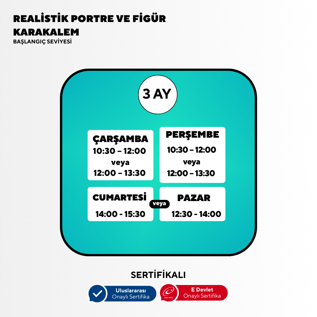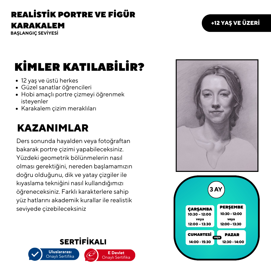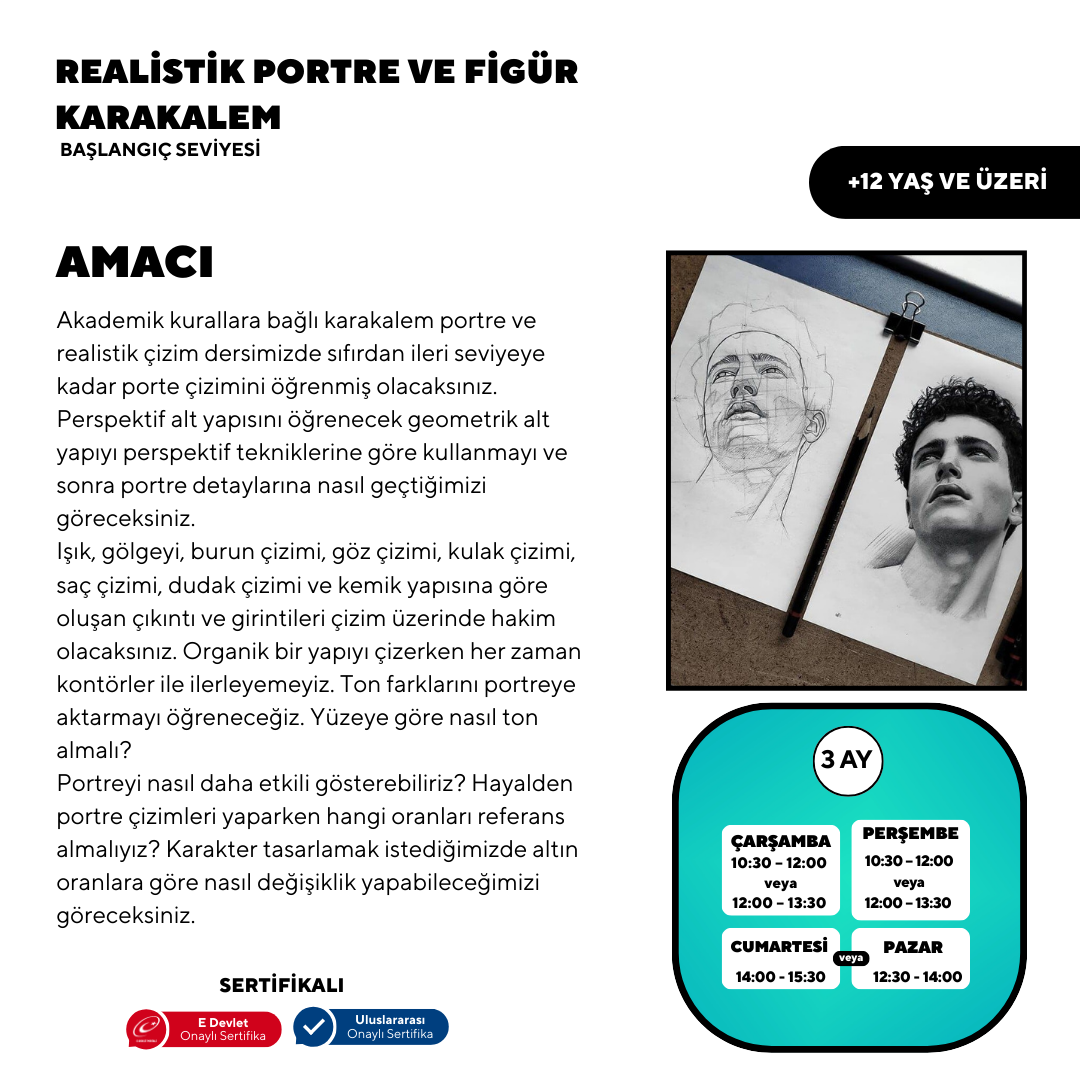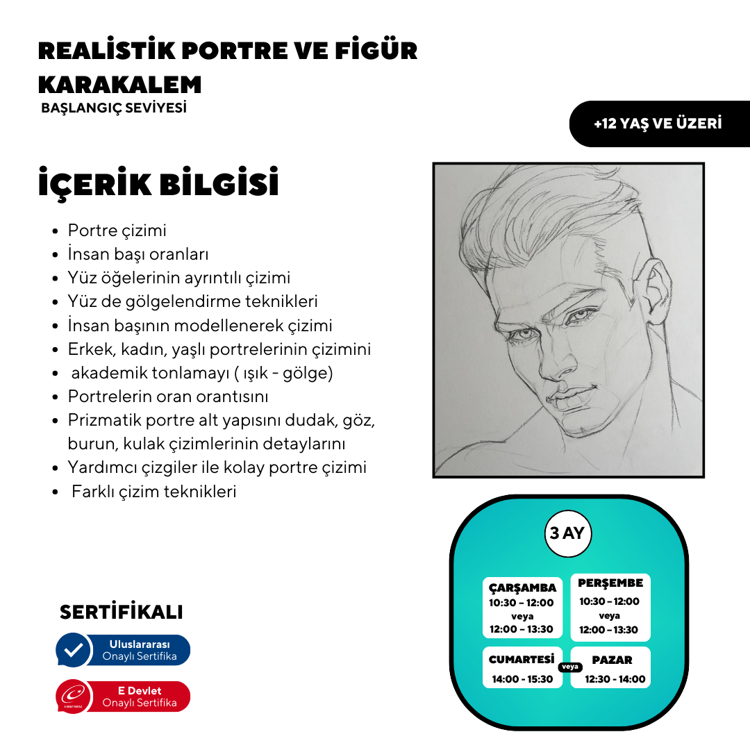 Akademik kurallara bağlı karakalem portre ve realistik çizim dersimizde sıfırdan ileri seviyeye kadar porte çizimini öğrenmiş olacaksınız. Perspektif alt yapısını öğrenecek geometrik alt yapıyı perspektif tekniklerine göre kullanmayı ve sonra portre detaylarına nasıl geçtiğimizi göreceksiniz. Işık, gölgeyi, burun çizimi, göz çizimi, kulak çizimi, saç çizimi, dudak çizimi ve kemik yapısına göre oluşan çıkıntı ve girintileri çizim üzerinde hakim olacaksınız. Organik bir yapıyı çizerken her zaman kontörler ile ilerleyemeyiz. Ton farklarını portreye aktarmayı öğreneceğiz. Yüzeye göre nasıl ton almalı? Portreyi nasıl daha etkili gösterebiliriz? Hayalden portre çizimleri yaparken hangi oranları referans almalıyız? Karakter tasarlamak istediğimizde altın oranlara göre nasıl değişiklik yapabileceğimizi göreceksiniz.