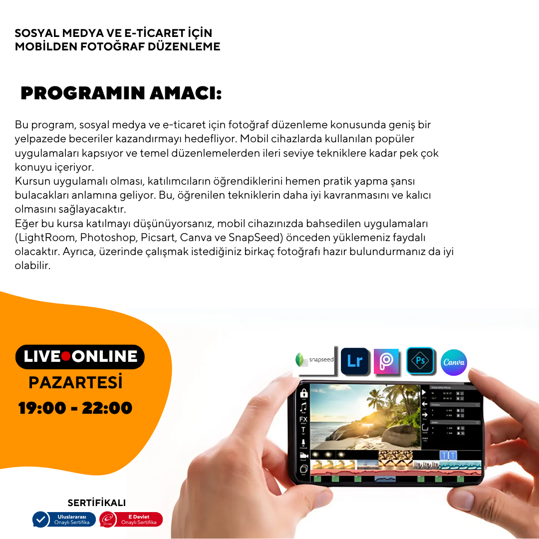 Bu program, sosyal medya ve e-ticaret için fotoğraf düzenleme konusunda geniş bir yelpazede beceriler kazandırmayı hedefliyor. Mobil cihazlarda kullanılan popüler uygulamaları kapsıyor ve temel düzenlemelerden ileri seviye tekniklere kadar pek çok konuyu içeriyor. Kursun uygulamalı olması, katılımcıların öğrendiklerini hemen pratik yapma şansı bulacakları anlamına geliyor. Bu, öğrenilen tekniklerin daha iyi kavranmasını ve kalıcı olmasını sağlayacaktır. Eğer bu kursa katılmayı düşünüyorsanız, mobil cihazınızda bahsedilen uygulamaları (LightRoom, Photoshop, Picsart, Canva ve SnapSeed) önceden yüklemeniz faydalı olacaktır. Ayrıca, üzerinde çalışmak istediğiniz birkaç fotoğrafı hazır bulundurmanız da iyi olabilir.