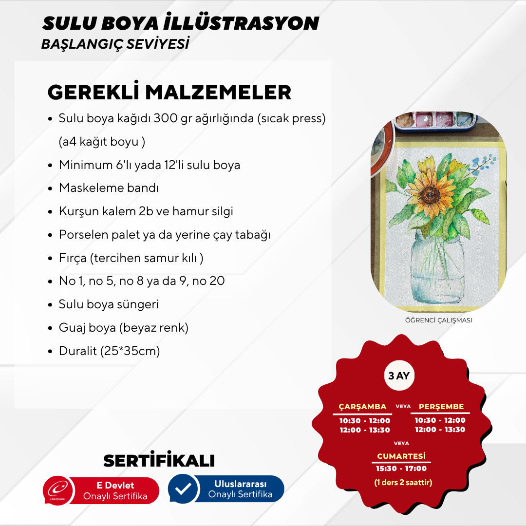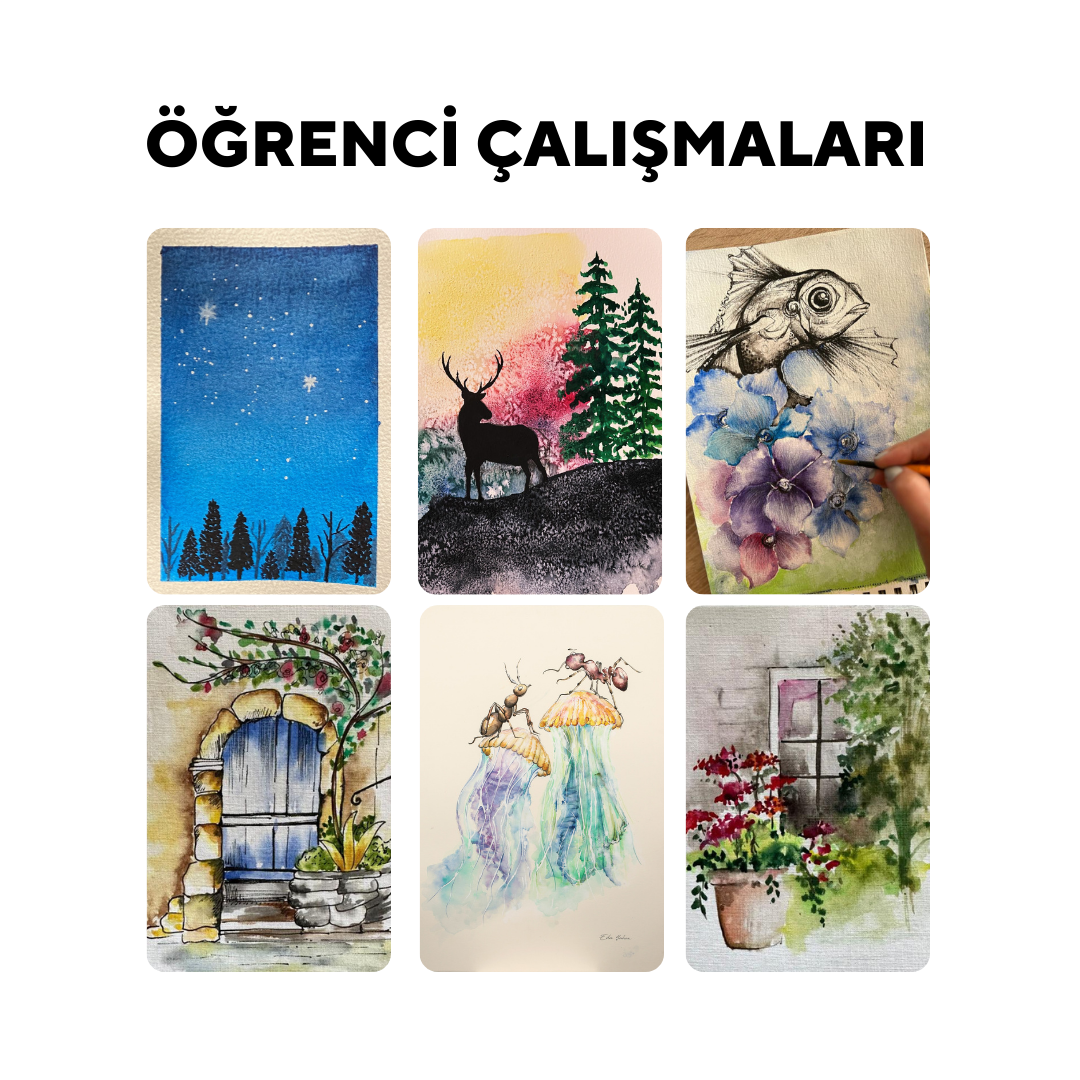 1. Suluboyaya giriş, suluboya malzemelerinin özellikleri (boya, fırça, kâğıt, palet, su kabı vb) Fırça kullanımı, su miktarının kontrolü, su ve boya karışımı, koyudan açığa ve açıktan koyuya geçişler, kat kat çalışma (tek renk)