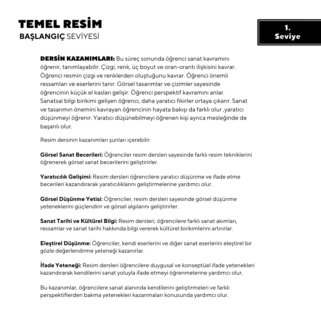 İlk 3 aylık başlangıç seviyesinde kursiyer derslerde genellikle hem teorik bilgi hem de uygulamalı çalışmalar öğretilir. Öğrencilere farklı resim tekniklerini deneme fırsatı verilir ve kendi yaratıcı tarzlarını geliştirmeleri teşvik edilir. Bu ders programı genellikle öğrencilere resim sanatına genel bir giriş sunar ve temel becerileri geliştirmeyi amaçlar.