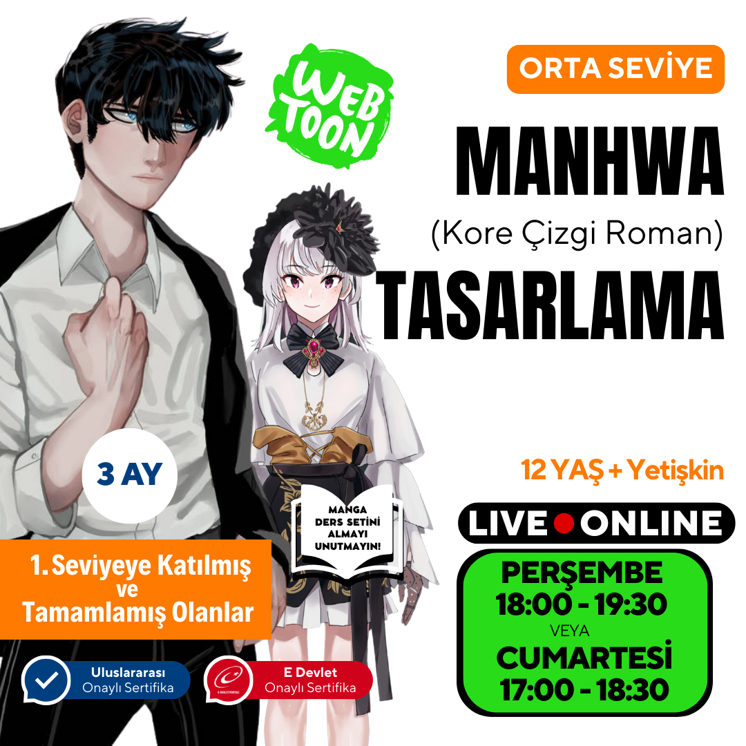 - Tüm öğrenilenlerle Webtoon veya Manhwa serisi hazırlamak Senaryo eğitimi Çizimi dijitalleştirme teknikler